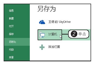 切换至需要保存的工作簿窗口,①单击快速访问工具栏中的“保存”按钮,如图2-10所示,自动切换至“另存为”选项面板,②单击“计算机”选项,如图2-11所示,选择保存在计算机中。