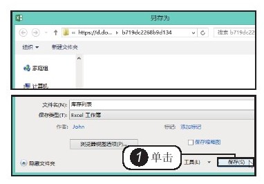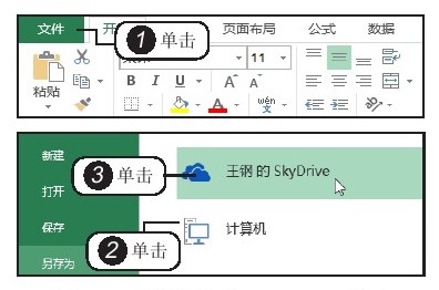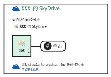 打开实例文件\第2章\原始文件\库存列表.xlsx,①单击左上角的“文件”按钮,②在弹出的菜单中单击“另存为”命令,③然后在右侧单击SkyDrive选项,如图2-14所示,选择保存到SkyDrive云网盘中,④在右侧的SkyDrive界面中单击“浏览”按钮,如图2-15所示。
