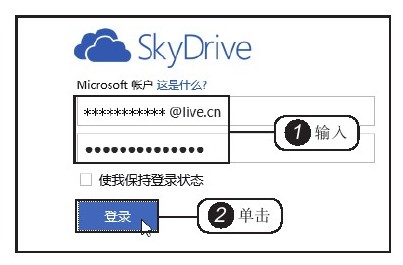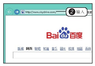 弹出“另存为”对话框,保持地址栏的默认显示位置,①单击“保存”按钮即可将其保存到SkyDrive云网盘中,如图2-16所示,若要查看是否保存成功,则启动IE浏览器,②在地址栏中输入http://www.skydrive.com后按【Enter】键,如图2-17所示。