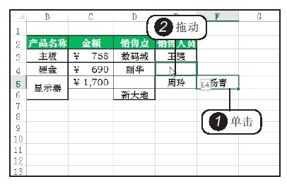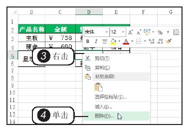 此时可看见E4单元格的内容自动下移,①选中F5单元格,②将其拖至E4单元格中,如图2-49所示,选择要删除的单元格,例如选择D5单元格,③右击该单元格,④在弹出的快捷菜单中单击“删除”命令,如图2-50所示。