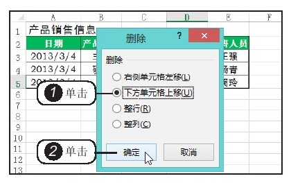 弹出“删除”对话框,在“删除”选项组中选择其他单元格的移动方式,①例如选择单击选中“下方单元格上移”单选按钮,即删除D5单元格后自动将D6及与D6同列的下方单元格向上移动,②然后单击“确定”按钮,如图2-51所示,返回工作簿窗口,此时可看见D6及与D6同列的下方单元格自动向上移动,如图2-52所示。