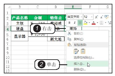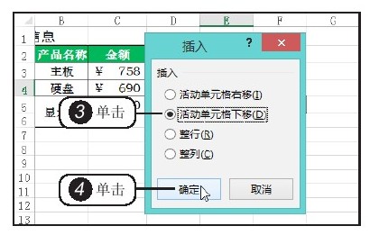 打开实例文件\第2章\原始文件\产品销售信息1.xlsx,选择插入单元格的位置,例如选择在E4单元格上方插入单元格,①则右击E4单元格,②在弹出的快捷菜单中单击“插入”命令,如图2-47所示,弹出“插入”对话框,在“插入”选项组中选择其他单元格的移动方式,③例如选择单击选中“活动单元格下移”单选按钮,即插入单元格后自动将E4及与E4同列的下方单元格向下移动,④然后单击“确定”按钮,如图2-48所示。
