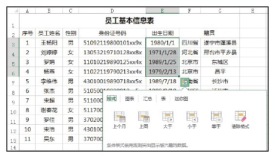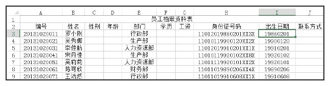 Excel 2013的“快速填充”功能能够根据用户输入的数据识别模式,一次性输入剩下的数据。“快速填充”功能可以处理需要拆分的多个列的任何数据,可以使用它根据某个示例填写数据。如在某列输入身份证号码,在另一列的首个单元格中输入代表出生日期的身份证号码位数,使用“快速填充”工具将自动填充身份证号码对应的出生日期,如图1-2所示。