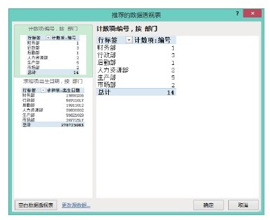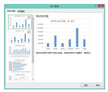Excel 2013在“插入”选项卡下,比以前的版本多了“推荐的数据透视表”和“推荐的图表”按钮。单击“推荐的数据透视表”按钮,Excel 2013会汇总选择的数据,并提供各种数据透视表选项的预览,用户可以选择能够体现自己观点的数据透视表选项,如图1-3所示;单击“推荐的图表”按钮,Excel 2013会根据用户选择的数据推荐能够最好地展示数据模式的图表,如图1-4所示。