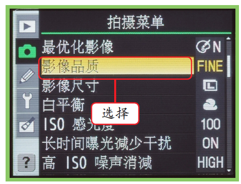开启数码相机后,在“拍摄菜单”中选择“影像品质”选项,按下 OK 按钮。
