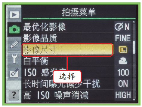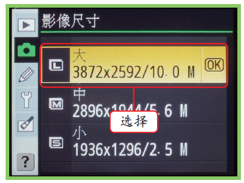 在“拍摄菜单”中选择“影像尺寸”选项,按下 OK 按钮。