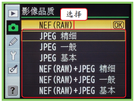 在“影像品质”选项菜单中,可以在 JPEG 、 NEF ( RAW )或 NEF ( RAW ) +JPEG 等几种格式中进行选择,确定后按下 OK 按钮。