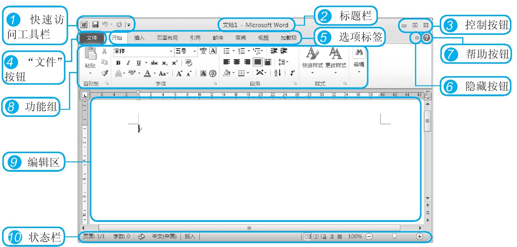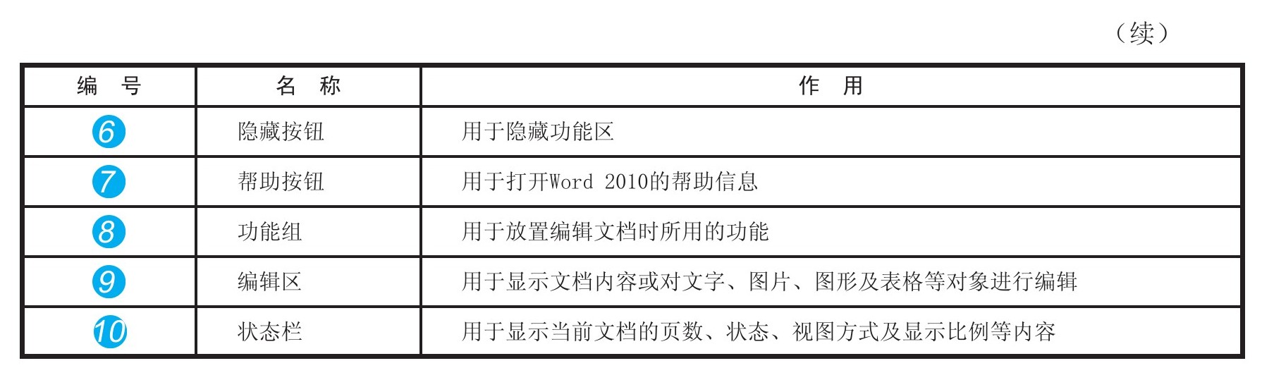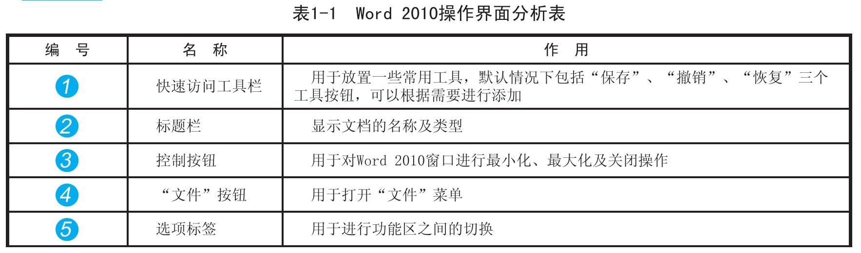 Word 2010是Office 2010程序中的一个文字处理程序,它提供了多种多样的功能,例如,可以在文档中编辑文字、图像、声音及动画等对象,从而使文档内容更加丰富多彩;也可以在其中进行图形制作,编辑艺术字、数学公式等,从而满足了用户对各种文档的处理要求。并且,Word 2010还提供了强大的制表功能,用户可以在Word 2010中自动制表,也可以手动制表。除了可以对表格进行修饰外,它还可以对表格中的数据进行计算,从而使我们对表格的应用更加得心应手。Word 2010的操作窗口根据不同的功能进行了不同区域的划分,具体划分如下图所示,各区域的作用如表1-1所示。