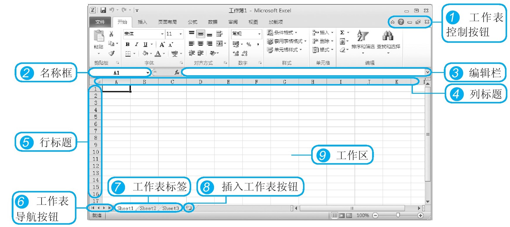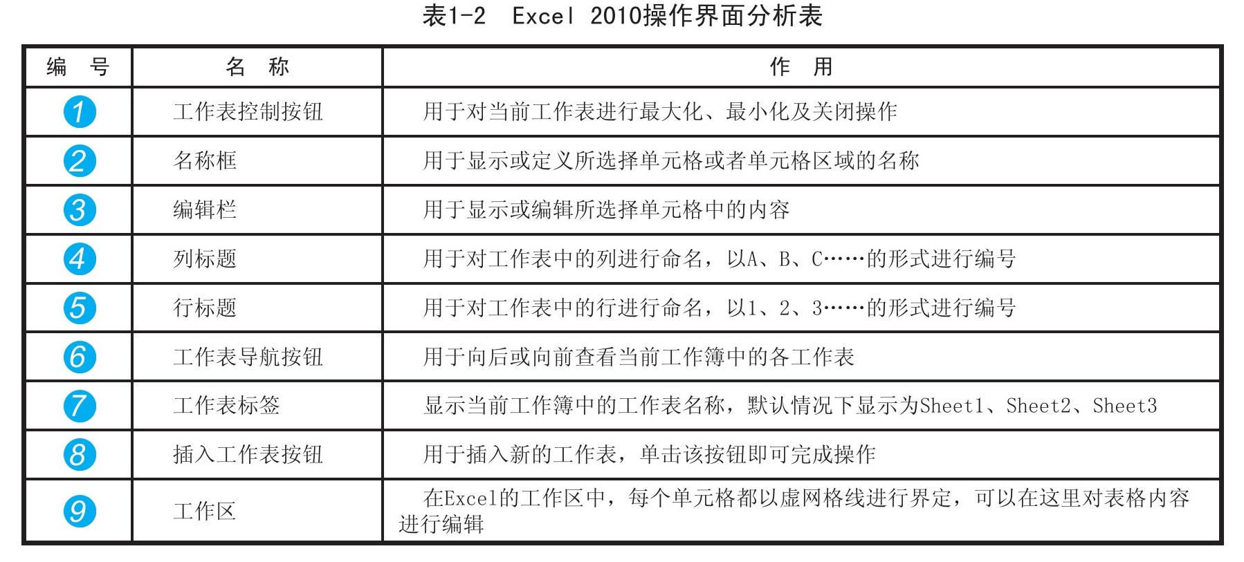 Excel 2010用于进行数据预算、财务统计及数据汇总等工作,利用它能够轻松地创建出专业级报表。另外,Excel 2010可以通过公式和函数进行复杂的数据运算、查询和分析,从而使数据处理变得轻松、便捷。Excel 2010与Word 2010的操作界面有不同之处,也有相同之处,本小节只对Excel 2010中与其他组件不同的功能进行介绍。Excel 2010的操作界面如下图所示,各区域的作用如表1-2所示。