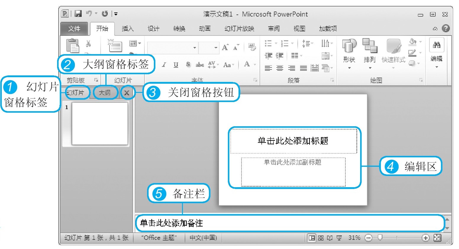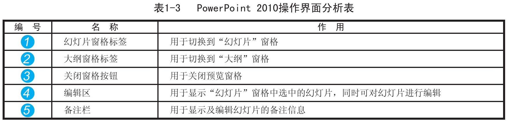 PowerPoint 2010用于创建动态演示文稿,它在我们的演讲、教学和产品演示等工作中是一个很好的工具。用户通过PowerPoint 2010可以与使用不同平台和设备的其他用户进行交流。PowerPoint 2010可以使用清晰的图示说明、丰富的色彩及精彩的动画效果来演示文稿,并有多种播放文稿的方式。下面介绍PowerPoint 2010操作界面的与众不同之处,具体效果如下图所示,各区域的作用如表1-3所示。