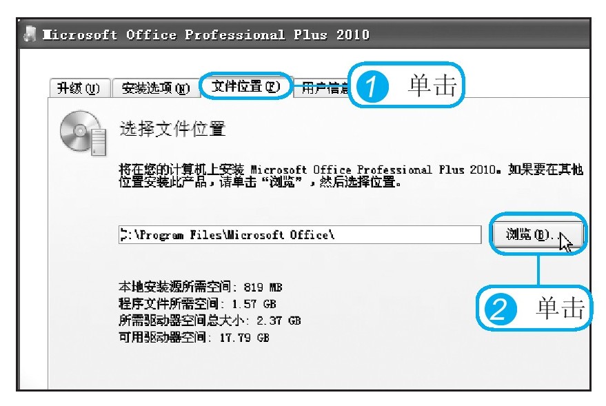 在安装Office 2010时,程序会默认选择安装到C盘,用户可根据电脑的需要对安装路径进行选择。另外,安装程序中包括多个组件,用户可根据需要对安装的组件进行选择。