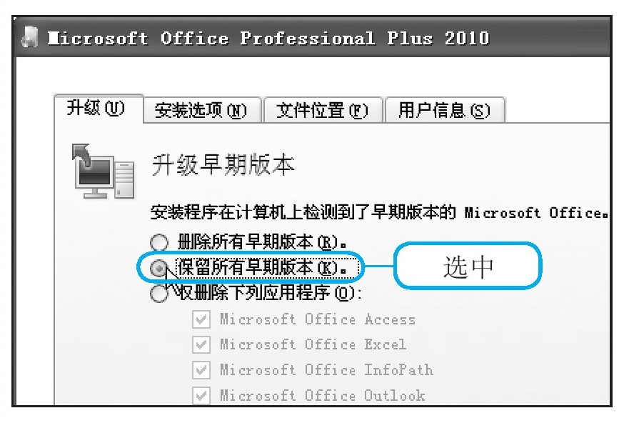 进入“升级早期版本”界面,如果需要保留电脑中的早期Office程序,则选中“保留所有早期版本”单选按钮。