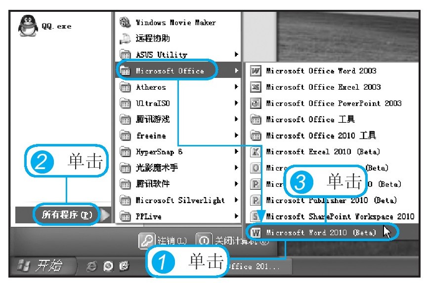 将Office 2010安装到电脑中后,系统会自动在“开始”菜单中添加一个Office 2010的启动程序,所以当需要启动Office 2010中的组件时,可通过“开始”菜单完成操作。本小节以启动Word 2010为例,介绍启动的步骤。