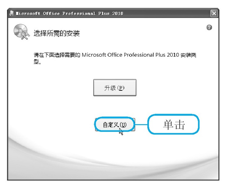 进入“选择所需的安装”界面,单击“自定义”按钮。
