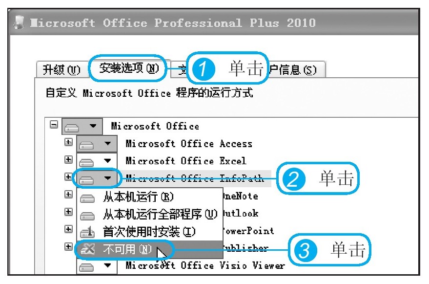 2 单击不需要安装的Microsoft Office InfoPath选项左侧的按钮。