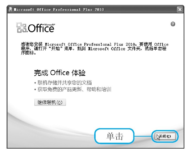 经过以上操作后,安装向导就会执行程序的安装操作,并在向导界面中显示安装进度。程序安装完毕后,进入安装完成界面,单击“关闭”按钮,就完成了Office 2010的安装操作。