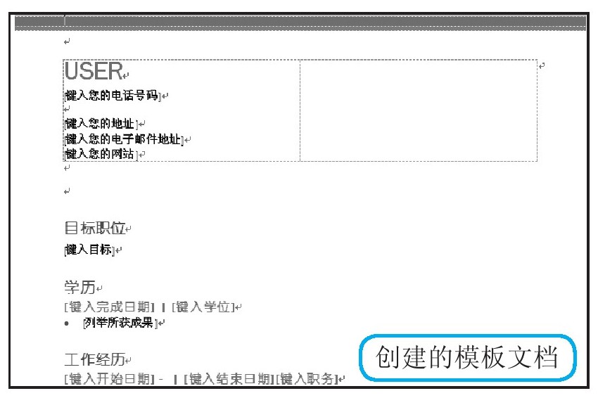 经过以上操作后,即可创建一个平衡简历的模板文档,在文档的界面中已设置好“目标职位”、“学历”等内容的格式,用户只要将自己的情况填写到相应位置即可。