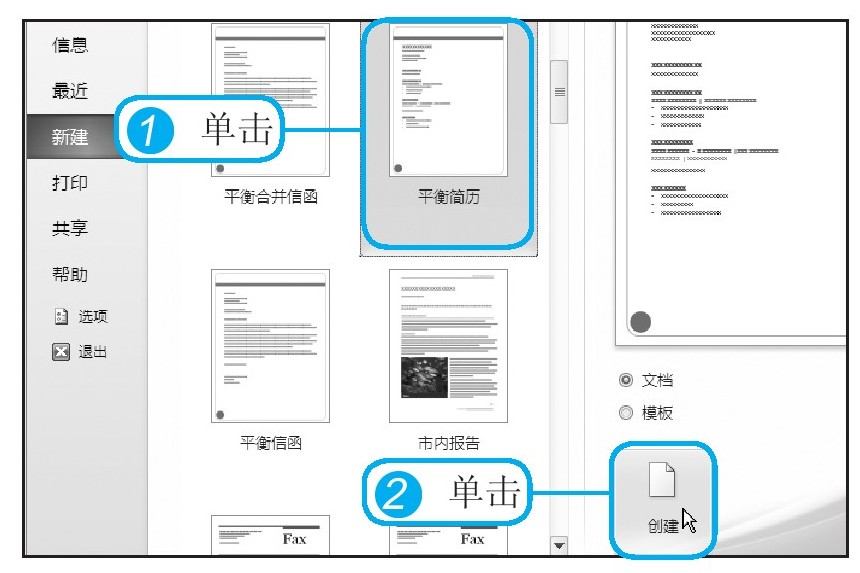 1 当菜单中显示出模板样式后,单击“平衡简历”图标。