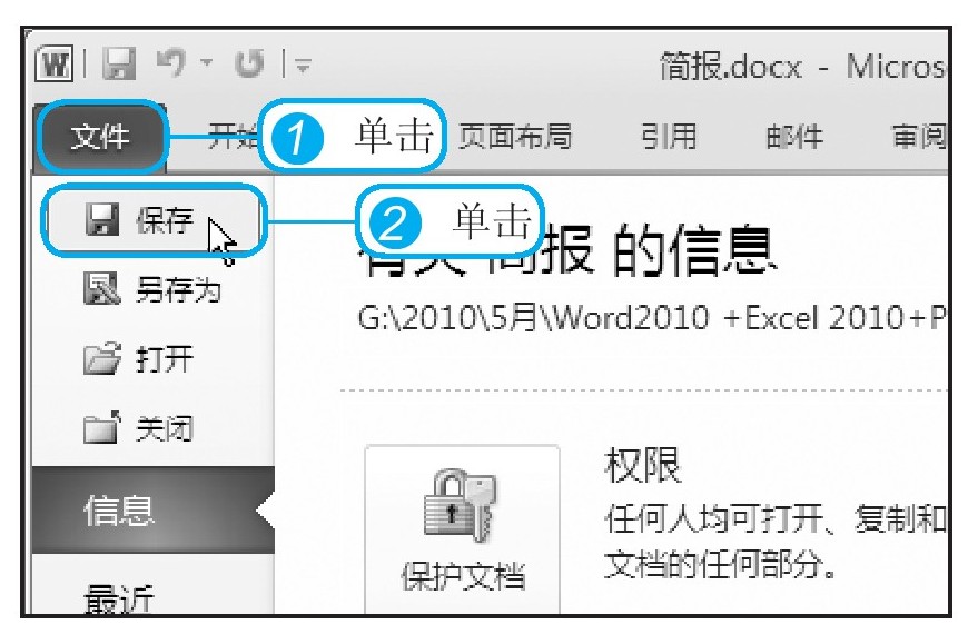 为了防止电脑出现突然断电等情况造成文件丢失,最好随时对文件进行保存。在保存文档时,有将文档保存在原位置及另存在其他位置两种方式,可根据需要选择适当的保存方式。本节仍以Word 2010为例,来介绍具体的操作步骤。