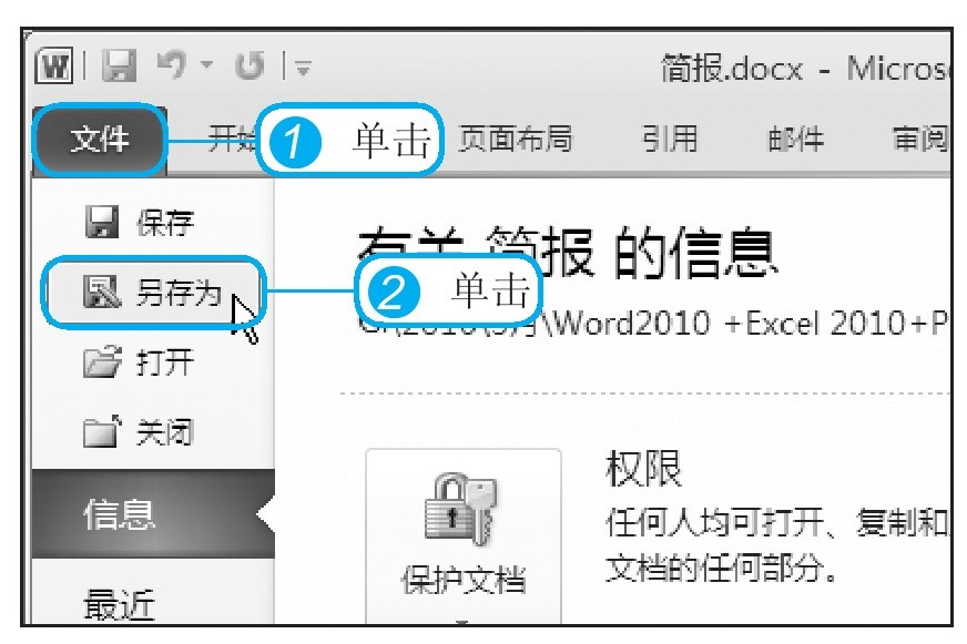 1 打开“实例文件\第1章\原始文件\简报.docx”文档,单击“文件”菜单按钮。
