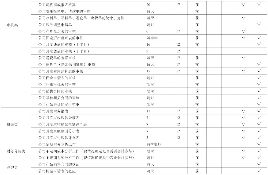 ·会计:如果是小公司(一个会计一个出纳的那种公司),那么会计负责的工作可能就比较杂一些。有的会计可能还负责行政方面的工作。当然这种情况较特殊,所以去小公司的会计人员要有一定的心理准备噢。由于公司小,老板要一岗多用,有时也顾不了太多不能相容岗位相分离的要求。一般每天会做如下一些工作,到了月初或月底,会计的工作可能还不止这些。