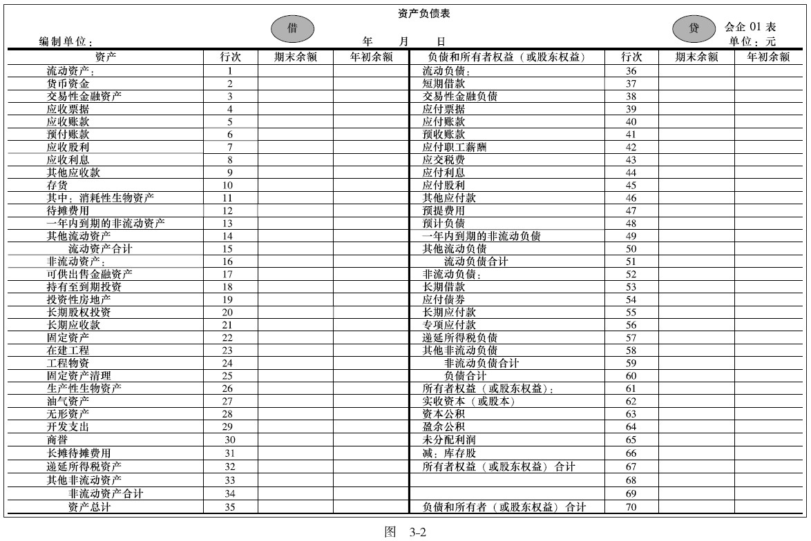 借贷记账法记载哪些科目在借方,哪些科目在贷方,是不少同学学习时的一个困惑。其实大家注意资产负债表的账户结构,就是一个大的丁字形账户。左边是借方,右边是贷方。左边是资产类,右边是负债类和所有者权益类。所以表上对应这三类科目的位置,也是余额一般所在的方向,如图 3-2 所示。