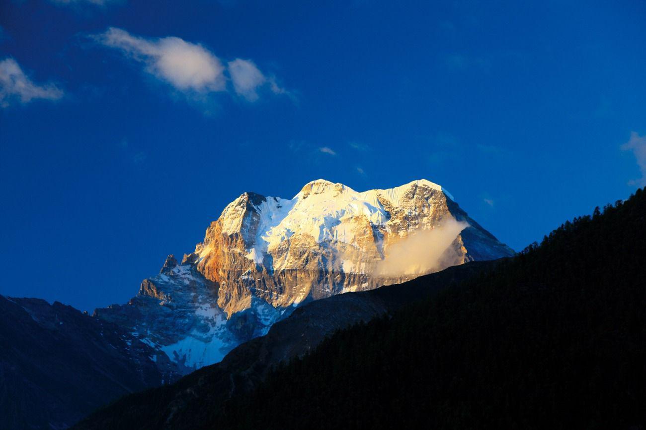 央迈勇为“三怙主”雪山的南峰,在佛教中排在“三怙主”雪山之首。文殊菩萨在佛教中是智慧的化身,雪峰像文殊师利手中的智慧之剑直指苍穹,冰清玉洁的央迈勇傲然立于天地之间。1928年,洛克先生在云南与稻城毗邻的群山重岭中,遥望见了央迈勇,被它圣洁、高贵的气质折服,在他的日记中写到“它(央迈勇)是我见到的世界上最美的山峰”。