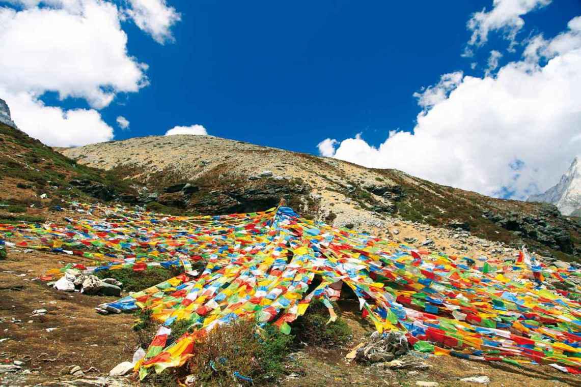 夏诺多吉是“三怙主”雪山的东峰。夏诺多吉神山峰耸立在天地之间,在佛教中是除暴安良的神,他勇猛刚烈,神采奕奕,胯下围着斑斓的虎皮,腰间绕着罪恶的大蟒。洛克先生把它形容为展开巨翅蓄势待飞的蝙蝠,将它比喻成希腊神话中的雷神,神山左边的绿色大理石山头为布鲁财神,右下方为马头金刚,马头金刚下方的丹霞风林地貌为八百罗汉,神山脚下洛绒牛场边是当年洛克先生的宿营处。