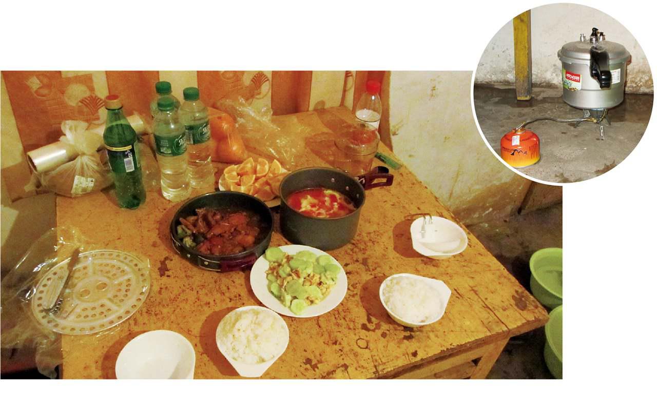 环境是如此恶劣,条件又如此窘迫,我却兴奋得很。总算是有地方可以把带的东西全部用上了,睡袋搬出来,脸盆拿出来,头灯带起来,这才是驴友的气势嘛。因为车就停在门口,搬东西也非常方便,原始的环境激发了我们自己做菜的欲望。水果、蔬菜、肉、米饭全部隆重登场。一番折腾之后,一桌美味出炉。西红柿蛋汤,蛋炒黄瓜,尖椒牛柳(昨天吃剩下打包过来的),还有饭后水果—橙子,怎么样,是不是超美味呢?
