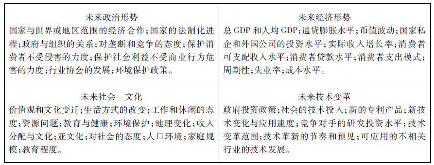 PEST分析中涉及的要素通常针对过去发生的事件以及组织已经拥有的经验,该分析过程也可以用来对未来的状况进行预测说明(见表2-1)。