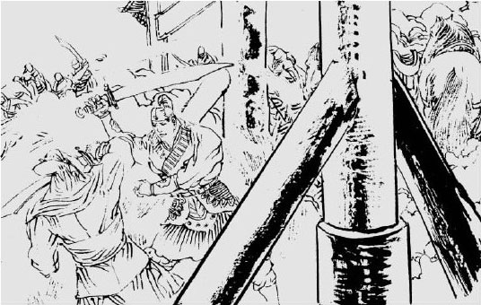 且说李密君臣四人来到潼关界口,太守盛彦古闻知邢国公同公主降香,连忙出关迎接。把李密接到帅府,施礼坐下。李密问:“盛太守!你这里有多少人马?”盛彦古说:“有三千人马!”李密说:“既有三千军士,借我一千,保娘娘驾到太行山降香!”盛彦古说:“大王!潼关的军士,保障边关,镇守汛地,况朝廷不时差官点检。如要动我关上人马,须是奏过朝廷,有兵符方可调用!”李密见说大恼,想:“在金墉为君之日,数十万雄兵,几百员战将,随我调遣,如今来到唐朝,要借一千军用,还须请旨。我恰守些甚么!”叫建德说:“不就此处开刀,更待何时!”急扯沙鱼鞘,晃出宝妆刀,李密掣剑在手,趱步上前,把盛彦古一把拉住。盛彦古不知情,吃了一惊,只要挣走,又被建德夹攻,一剑过去,把盛彦古砍为两段!