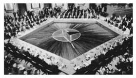 1949年4月4日,美、加、英、法、比、荷、卢、丹、挪、冰、葡、意十二国外长在华盛顿举行北大西洋公约签约仪式。8月24日,北大西洋公约正式生效。北约作为以苏联及社会主义阵营为对手的军事集团,设有统一的军事指挥系统,即欧洲盟军最高司令部和各分司令部,历任最高司令一职均由美国人担任。北大西洋公约组织(North Atlantic Treaty Organization)的成立,是美国完成以欧洲为重心的全球战略部署的重要标志,也是冷战进入高潮的反映。继2004年原东德等七国加盟至今,北约组织共有26个成员国。