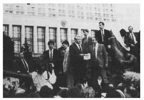 叶利钦站在被包围的俄罗斯议会大厦,即“白宫”外面一辆坦克顶上的演说令人难忘。