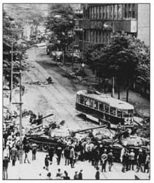 1968年8月20日的夜间,数十万备有现代化武装的苏联和华沙条约其他成员国的军队,采用突然袭击的方式,一夜之间侵占了捷克斯洛伐克的首都布拉格。苏军占领布拉格后,当时的苏联领导人勃列日涅夫下令逮捕了捷克斯洛伐克当时的领导人,包括捷共第一书记杜布切克,总理切尔尼克,国民议会主席斯姆尔科夫斯基等人。布拉格从暖春变成了寒冬。