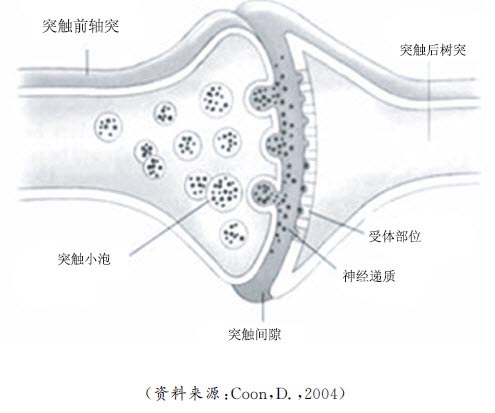 突触传递是一个“电—化学—电”的传递过程。所谓的化学传递过程是通过神经递质完成的。神经递质(neurotransmitter)是由突触前神经元合成并在末梢处释放,能特异性地作用于突触后神经元上的受体,并使突触后神经元产生一定效应的信息传递物质。神经递质存储在突触小泡内,当神经冲动(电传递)到达终扣时,有些突触小泡会破裂,并通过突触前膜的张口处将储存的神经递质释放出来。当这种神经递质经过突触间隙后,抵达突触后膜,为了完成突触传递,神经递质必须与镶嵌在突触后膜上的受体分子相结合,从而引起后膜对某些离子通透性的变化,随即发生一定程度的去极化。这种发生在突触后膜上的电位变化称为突触后电位。神经递质的释放可能使下一个神经元兴奋,并发出神经冲动,也可能抑制下一个神经元。一个神经元不只接收一个神经元的信息,而是从数以百计的神经元那里接收信息,因此会有若干兴奋信息和抑制信息同时到达。接收信息的神经元会整合接收到的信息,然后决定是否发放动作电位。