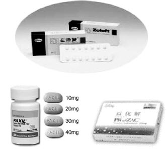 5-羟色胺(serotonin)会影响情绪、饥饿、睡眠和唤醒。产生5-羟色胺的神经元全部都位于脑干,这一结构与唤醒水平和自主神经过程有关。5-羟色胺的缺乏与抑郁有关,许多抗抑郁药物如百忧解(Prozac)、左洛复(Zoloft)和赛乐特(Paxil)等都是5-羟色胺再吸收抑制剂(见图2-3),通过阻碍神经元对5-羟色胺的再吸收增加了大脑中5-羟色胺的水平。