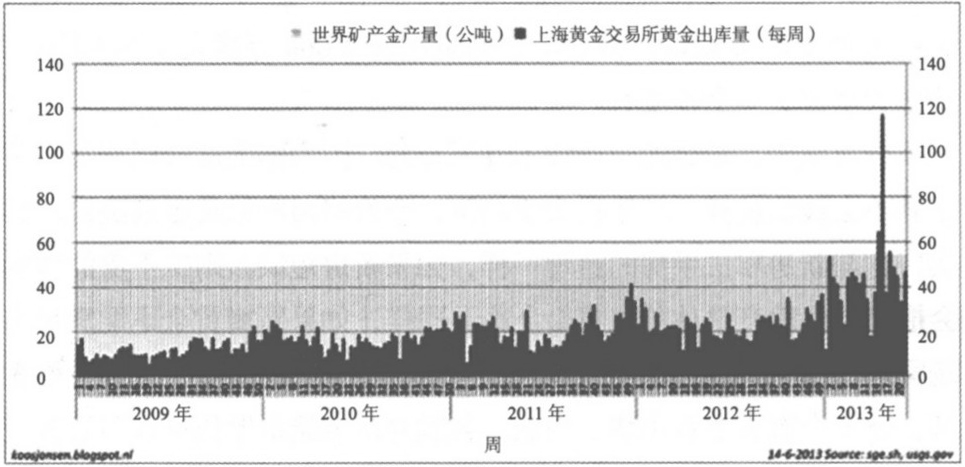 2013年4月黄金暴跌之后,中国上海黄金交易所的出库量表明,中国已经吃掉了同期世界黄金矿产金的绝大部分,而印度的黄金消费与中国不相伯仲,仅中印两国2013年就可能吃掉2000吨以上的黄金,中东以及全球央行至少将购入1000吨,世界其他地区的实物黄金热也在更低的金价刺激下迅速升温。