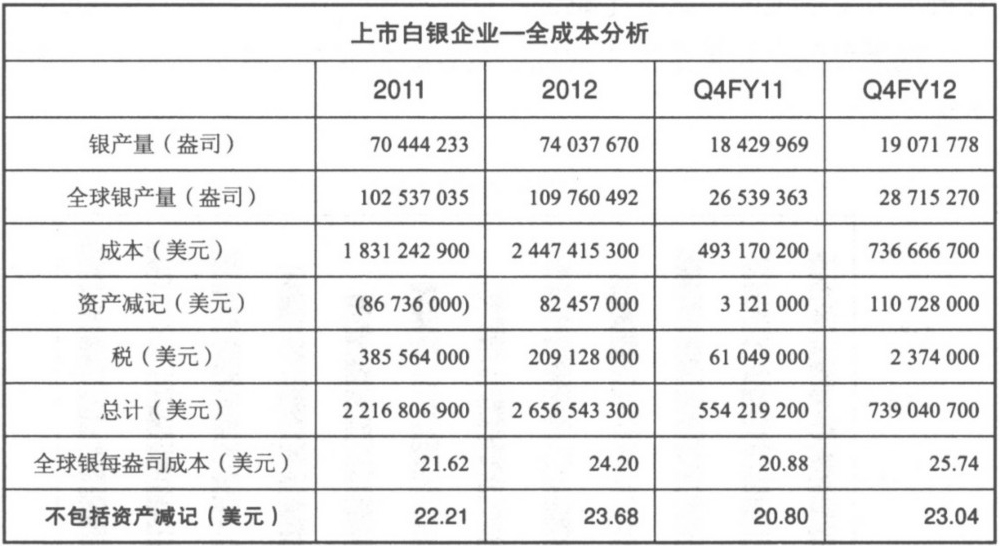 另外,赫巴投资公司还对白银做了全成本测算,结果发现2012年第四季度全世界所有上市白银企业(总产量7000万盎司,约占全球总产量的10%)的平均全成本为23.04美元,2011年同期为20.80美元,成本同比增长10.8%。