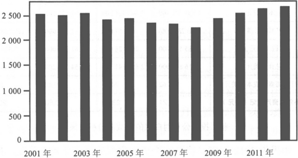 2001—2012年世界黄金生产示意图,由图可见,总量变化不明显