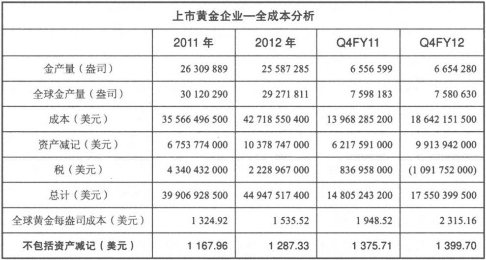 赫巴投资公司(Hebba Alternative Investments)以“全成本法”对世界所有上市的黄金公司进行了系统研究。这些公司2012年的黄金总产量为800吨,约占2012年全球黄金矿产金总量(2700吨)的1/3,具备足够的代表性。