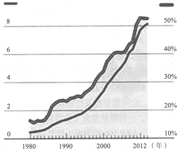 20世纪80年代以来,美国公司债券总规模持续攀升,2012年占美国GDP的50%