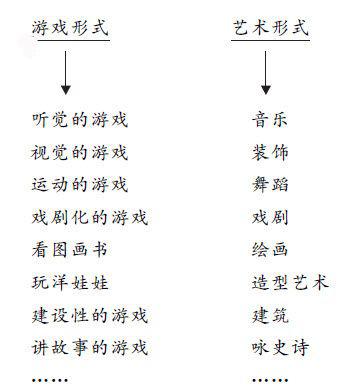 在游戏过程中,艺术所具备的感性形象、想象、情感、意志冲突、身体动作、语言、声音等不可分割地联系在一起;儿童的游戏种类繁多,每一种游戏都密切地联系着一种艺术形式。比如:朗格曾列出如下表格——