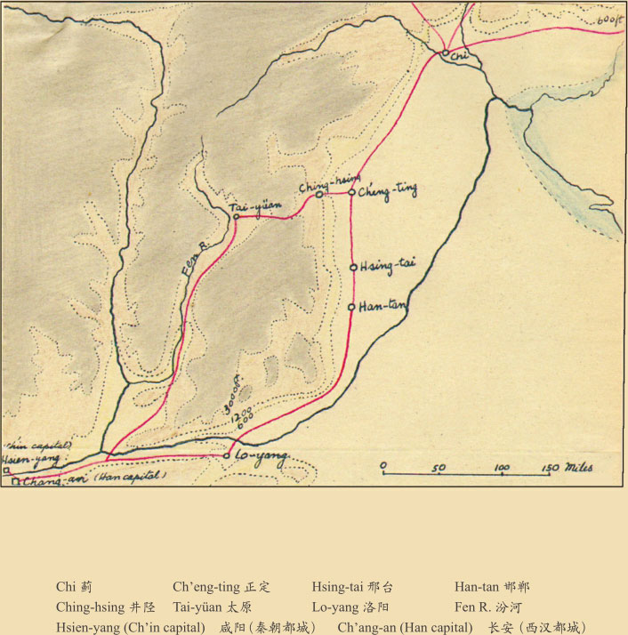 此外,秦朝国都与蓟城之间还有一条捷径可以联系,这条支路在秦朝得到充分发展。这条支路很可能是在距渭河流入黄河的河口不远的地方跨过黄河,然后沿着汾河河谷向东北方抵达太原,从太原转而向东,穿过井陉关以后,与太行山东麓的南北大道在正定交汇。