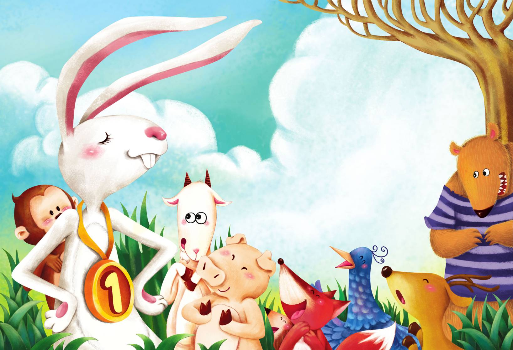 美丽的大森林里住着很多动物,其中有一只漂亮的兔子。她浑身像雪一样洁白,有着红宝石般的眼睛,人见人爱。不仅如此,她还是大森林里赫赫有名的运动健将。每次参加跑步比赛,发令枪一响,兔子就会像离弦的箭一样冲向终点。