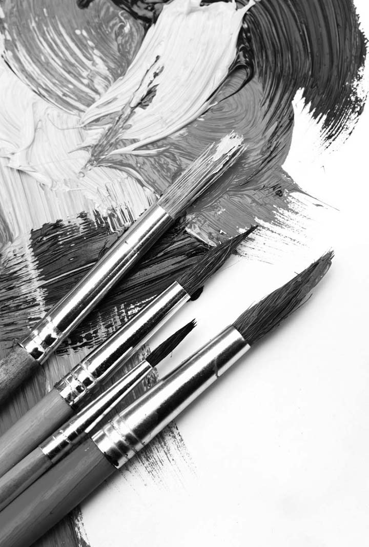 6. 画笔和画刀。画笔有不同的笔型和大小型号,分动物毛和人造毛两类,用于调色和画面着色。画刀有多种造型,主要用来调色、作画、刮色、清理画板等。