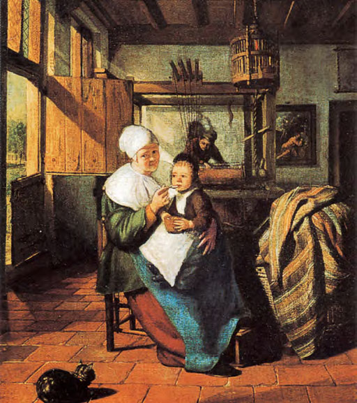 一位母亲正在喂自己的孩子,这是一个把卧室与工作间共用一个房间的家庭,通常这种家庭都比较贫困,刚刚拥有满足最基本的生活必需品。必需品不仅是能维持人的基本生存需要的必需品,通常还包括基本生产资料和维持工作效率的必需品。在一些地方,烟酒和时髦的衣服之类的奢侈品成为一种消费习惯,它们也属于习惯上的必需品。