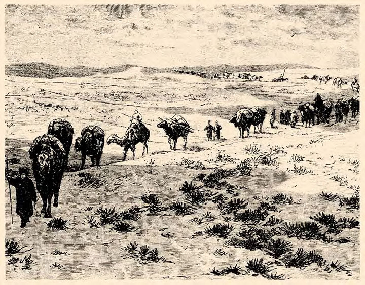 贸易是自愿的货品或服务交换,从古至今贸易在人们生活中都占据着重要的地位,最原始的贸易形式是以物易物,很少存在欺诈行为。金钱的出现简化和促进了贸易,生产者与消费者之间相距甚远,其不正当的行为不会被立刻发现也使欺诈的机会变得越来越多。图中是驼帮行进在荒凉的原野上。驼帮是古代重要的商帮,主要用骆驼运输商品,经陆路、水路远销蒙古一带。