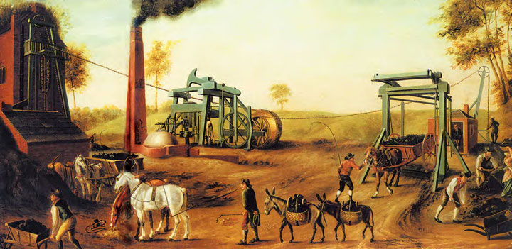 经济学非常关注人的贫困问题。1765年瓦特发明了蒸汽机,蒸汽机的使用不仅降低了工人的劳动强度,而且还提高了劳动效率,相应地工人的工资也得到了提高,使工人脱离了贫困,生活能得到极大的改善。图中为一台放置在矿洞入口的蒸汽机,正在传送高烟囱下面的半球形锅炉中的蒸汽,为升降工和煤的绞齿轮提供动力。