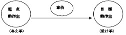 (Departure)と<着点>(Goal)、そして移動の<対象物>(Object)の三者が構文上·意味上において具備されていなければならない。同時に、この移動の「使役性」を表すためには、その<起点>に対し、<人間性>(Human) が要求され、<着点>に対しても同じ「人間性」が要求される。これは寺村(1982)の言う<対面>に相当し、この<人間性>に対する要請は松本(1997、2002)が取り扱っている通常の「使役移動構文」と異なるところでもある。この二つの<人間性>は<対象使役移動>においては、対立と相互依存関係を基盤として、〈授与者〉と〈授与目標〉の関係として現れる。このことを図で示すと、以下の図⑥のようになる。