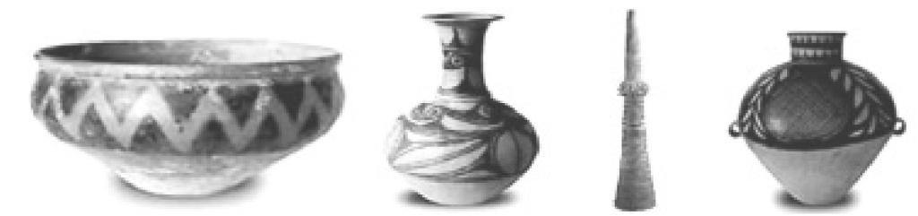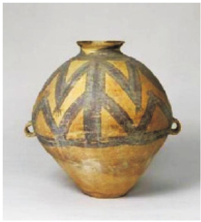 仰韶文化。常见图案是几何纹、装饰鱼纹、鹿纹、蛙纹、羊纹,以并列的斜线和三角为单位组成反复连续纹样,从而产生一种既富于节奏和条理又富于变化的形式美感。(如图2-3、2-4)
